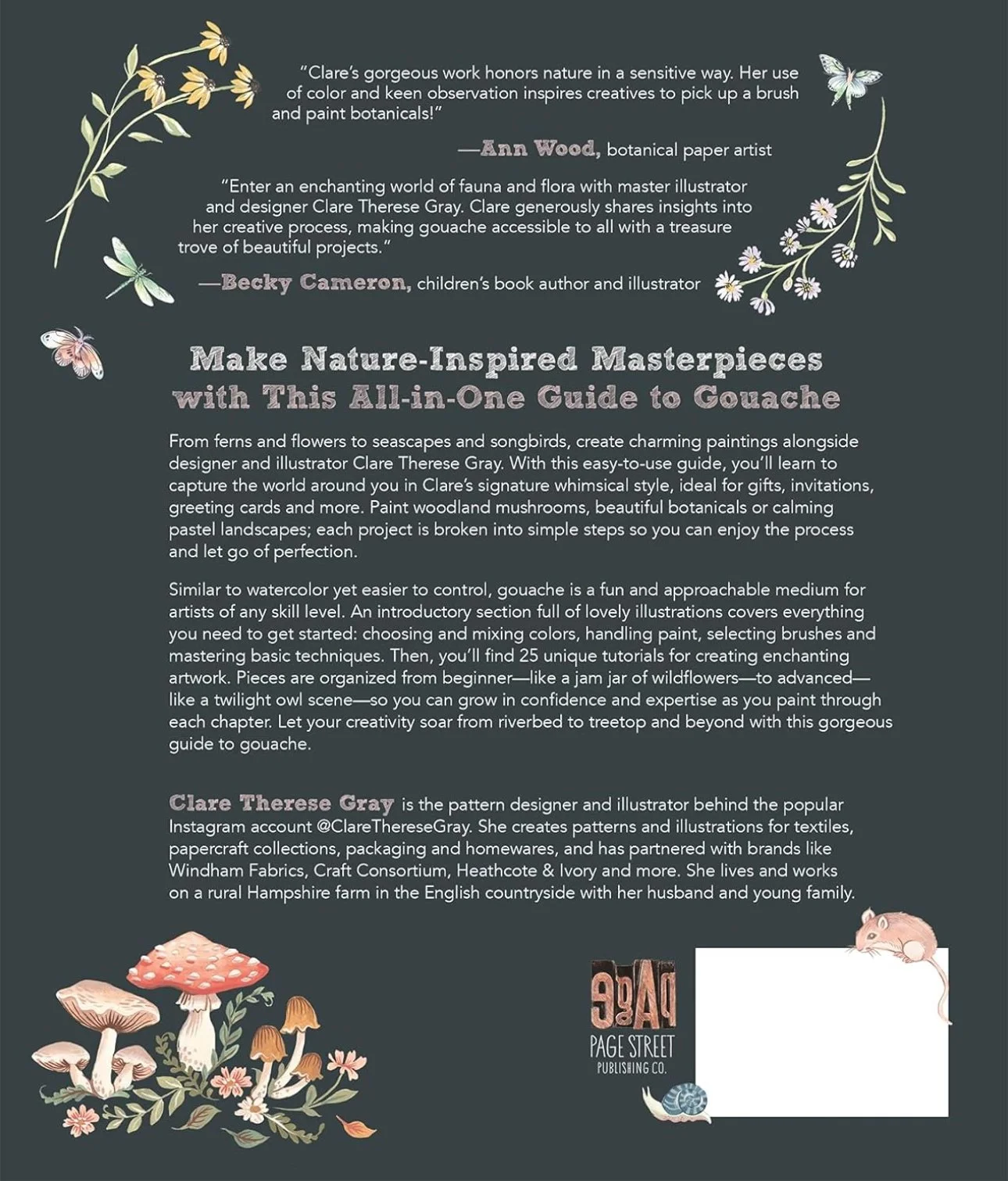 In this friendly guide to gouache painting―a new and trending form of watercolor―a talented artist gives readers everything they'll need to start painting relaxing countryside scenes. Make nature inspired masterpieces with this friendly all-in-one guide to gouache. From ferns and flowers to seascapes and songbirds, create charming paintings alongside popular designer and illustrator Clare Therese Gray. This book is packed with stunning illustrations accompanied by detailed instructions so that readers can enjoy each step of the way in creating their own painted masterpieces. You will learn to capture the world around you with Clare’s signature, whimsical style, ideal for gifts, invitations, greeting cards and more. Paint woodland mushrooms, beautiful botanicals or calming pastel landscapes; each project is broken into simple steps so you can enjoy the process and let go of perfection. Similar to watercolor yet easier to control, gouache is a fun and approachable medium for artists of any skill level. You’ll find 25 unique tutorials for creating enchanting relaxing artwork. Pieces are organized from beginner―like a jam jar of wildflowers―to advanced―like a twilight owl scene―so you can grow in confidence and expertise as you paint through each chapter. The book includes a thorough introductory section covering everything you need to get started: choosing and mixing colors, handling paint, selecting brushes and mastering basic techniques. Let your creativity soar from riverbed to treetop and beyond with this gorgeous guide to gouache.